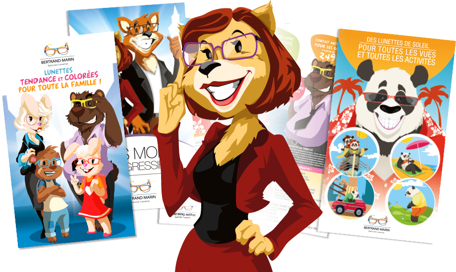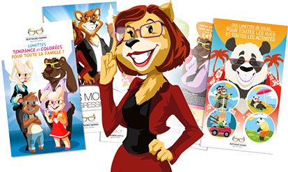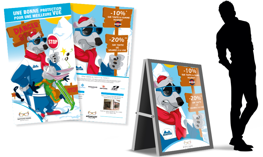 Création de concept pub avec personnages, flyer et PLV / BERTRAND MARIN Opticien Lunetier